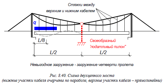 В распорных мостах усилия оттяжек (см. Висячие мосты — наиболее эффективны с точки зрения расстояния, перекрываемого мостовым пролетом. Из обзора видно, что в настоящее время расчет висячих мостов, как правило, проводится с учетом. Обзор современного состояния теории по этому вопросу приводится в гл.